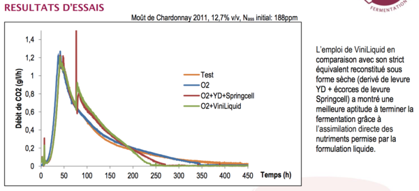 La partie insoluble (i.e. les écorces de levures) montre seule un impact cinétique très important et améliore l’efficacité fermentaire du complément azoté initial.