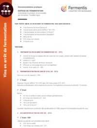 - Suivre un protocole spécifique de reprise de fermentation. Fermentis et Soufflet Vigne vous proposent un protocole fiable en 4 étapes avec réalisation d’un pied de cuve à partir d’une levure adaptée.