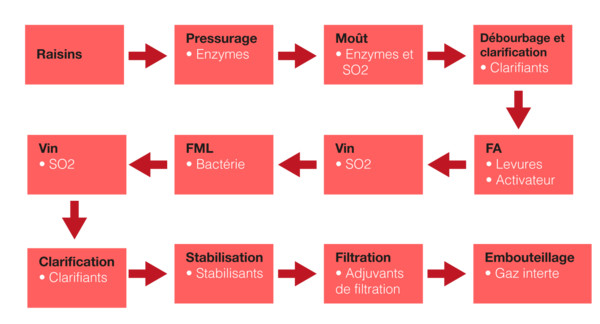 Le schéma suivant représente une vinification typique pour un vin blanc avec les adjuvants :